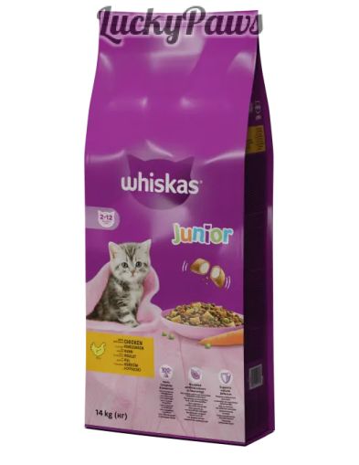 Whiskas Junior с пиле е разработена специално за нуждите на подрастващи котета от 2 до 12 месеца. Рецептата комбинира животински протеини за изграждане на мускулатурата и внимателно балансирани минерали (вкл. калций и фосфор) за здрави кости и зъби. Малките, хрупкави гранули улесняват разгризването и подпомагат поддържането на устна хигиена. Добавеният таурин е ключов за нормалната функция на сърцето и доброто зрение, а витамините и антиоксидантите подкрепят естествените защитни сили. Голямата опаковка от 14 кг е практична и изгодна за ежедневното хранене, особено при домакинства с повече от едно коте.