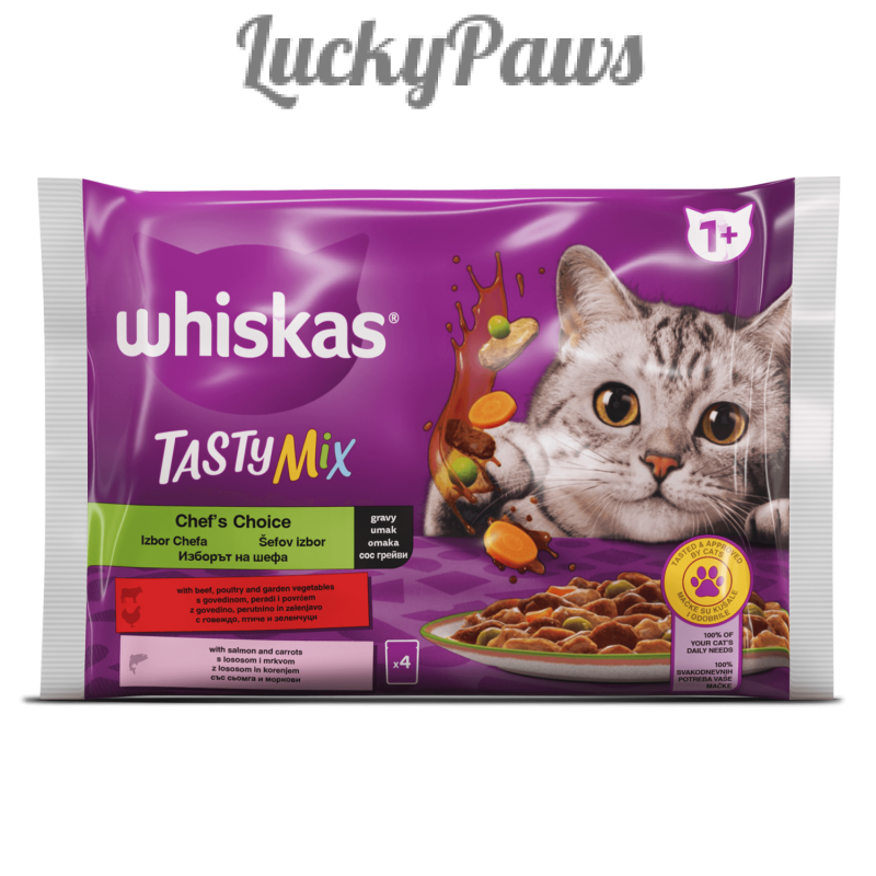 Whiskas Tasty Mix пауч 4х85 - С говеждо, птиче и зеленчуци; със сьомга и моркови