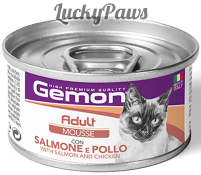 GEMON Adult Mousse with Salmon & Chicken – консерва със сьомга и пиле - пълноценна храна за котки в зряла възраст.