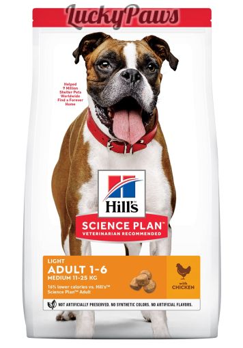 Храната Hill's Science Plan Light Medium Adult е пълноценна нискокалорична храна за кучета от средните породи (11-25кг) от 1 до 6 години, с тенденция за натрупване на наднормено тегло. Формулата с пилешко е прецизно балансирана формула за по-слабо активни кучета в зряла възраст, които се нуждаят от нискокалорична диета за поддържане на здравословно тегло и начин на живот. Без добавени изкуствени консерванти, овкусители и оцветители. (Пиле 10%; общо птичи продукти 16%).