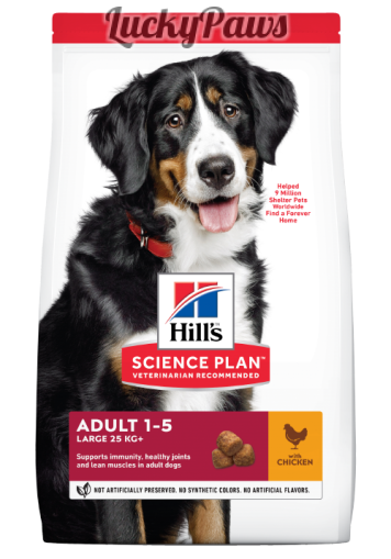 Храната Hill's Science Plan Large Breed Adult е пълноценна храна за кучета от едри /гигатски породи (25кг +) от 1 до 5 години, специално формулирана да задоволи енергийните им нужди в разцвета на годините им. Произведена от висококачествени, лесносмилаеми съставки. Без добавени изкуствени консерванти, овкусители и оцветители. (Пиле 7%; общо птичи продукти 10%).