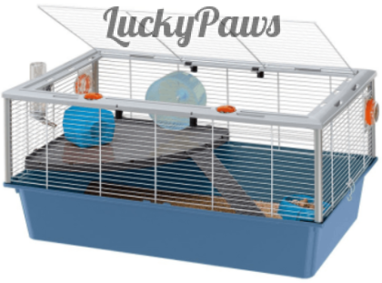 Голяма клетка за хамстери с дълбока пластмасова основа, която предотвратява разсипване на дървените стърготини. Конструкция от телена мрежа с колони и покрив, който се отваря и може да се обезопаси със странични закопчалки. Оборудвана: с широк рафт, разделящ клетката на две нива, стълба, гнездо за спане, поилка, купа за храна, въртележка. Клетката е модулна и позволява да се свърже с други чрез специалните конектори. Лесна за почистване.Размери: 78 x 48 x h 39 cm.