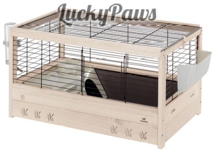 Къща за зайци, изработена от дърво и телена мрежа. Arena се предлага в три варианта: Arena 80, подходяща за морски свинчета, Arena 100 и 120, идеални за зайци.Оборудвана с хранилка, пластмасова купа, поилка, къщичка с удобен рафт и стълба. С изцяло вадещо се пластмасово дъно, позволяващо лесно почистване на отпадъците. Размери : Д82 х В45.5 х Ш52 см.