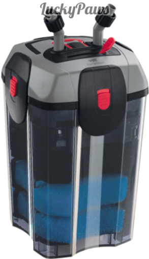 Ефективна външна филтрираща система за всички видове аквариуми. 4 етапа на филтрация за винаги кристално чиста вода в аквариума. Самозасмукваща система: затворете клапите, налейте вода, завинтете капачката, отворете клапите и включете в контакта. Удобен лост за отваряне и затваряне на клапите с включена система за защита. Пластмасови кошници, които могат да се изваждат. Контейнер от удароустойчив материал и с поддържащи крачета. Усточиви затварящи кукички с фибростъкло и бутон за безопасност срещу случайно отваряне. Помпа вградена в капака с керамичен вал и защита срещу прегряване.