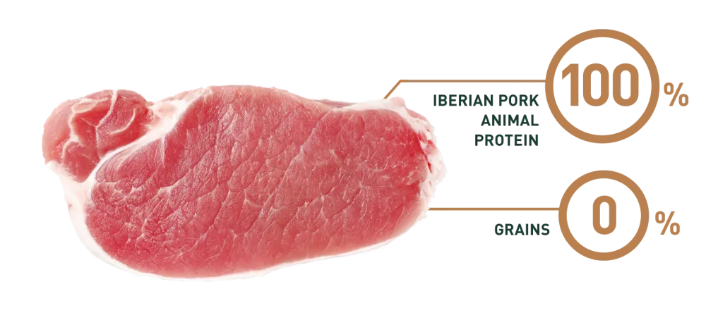 Състав:Дехидратирано иберийско свинско месо, тапиока, мазнина от домашни птици (Източник на Ω-6 мастни киселини), грах, мая и екстракт от мая-Saccharomyces cerevisiae (Източник на мананолигозахариди – MOS and β-глюкани), рибено масло (Източник на Ω-3-EPA и DHA мастни киселини), хидролизиран пилешки черен дроб, сладък картоф, рожков, картофен протеин, дехидратирани яйца, захарно червено цвекло, хидролизиран пилешки протеин, инулин (разтворима цикория, източник на фосфоолигозахариди – FOS), естествена целулоза (източник на неразтворими фибри), минерали, разтворими хранителни фибри - ектсракт от Plantago ovata, етерични масла (риган, канела, детелина, мащерка, розмарин, мента, зелен чай), хидролизирани ракообразни (източник на хондроитин), хидролизиран хрущял (Източник на глюкозамин), юка, концентрат от лиофилизиран сок от пъпеши (богат на супероксид дисмутаза-SOD).