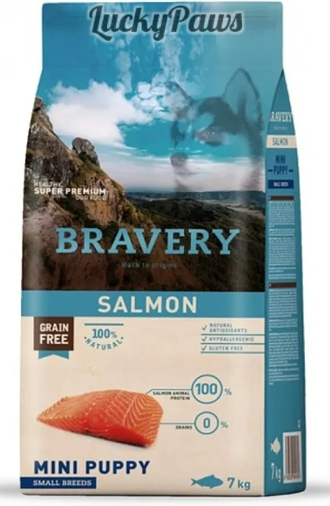 Пълноценна супер премиум беззърнена храна за подрастващи кученца от дребни и мини породи със сьомга. Bravery е изцяло натурална храна. Няма добавени изкуствени оцветители, подсладители или консерванти! Поради отсъствието на каквито и да е зърнени култури и наличието на единствен първокласен протеин от сьомга, храната е хипоалергенна. Благодарение на балансираните си натурални съставки, Bravery осигурява идеална грижа и цялостно укрепване на тялото.