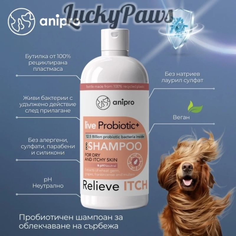 anipro Live Probiotic+ Reliеve Itch - пробиотичен шампоан за кучета при суха и сърбяща кожа с аромат на невен