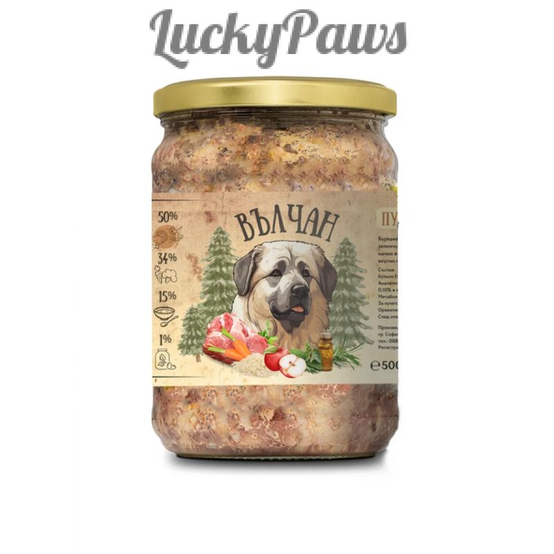 Бурканите на Вълчан са ежедневна храна за кучета. Приготвени са от месо, зеленчуци и хранителни добавки. Готви се в буркан чрез стерилизация. По този начин всички полезни вещества остават в буркана, което прави менюто питателно, вкусно и здравословно. Натурална храна без консерванти, овкусители и оцветители.