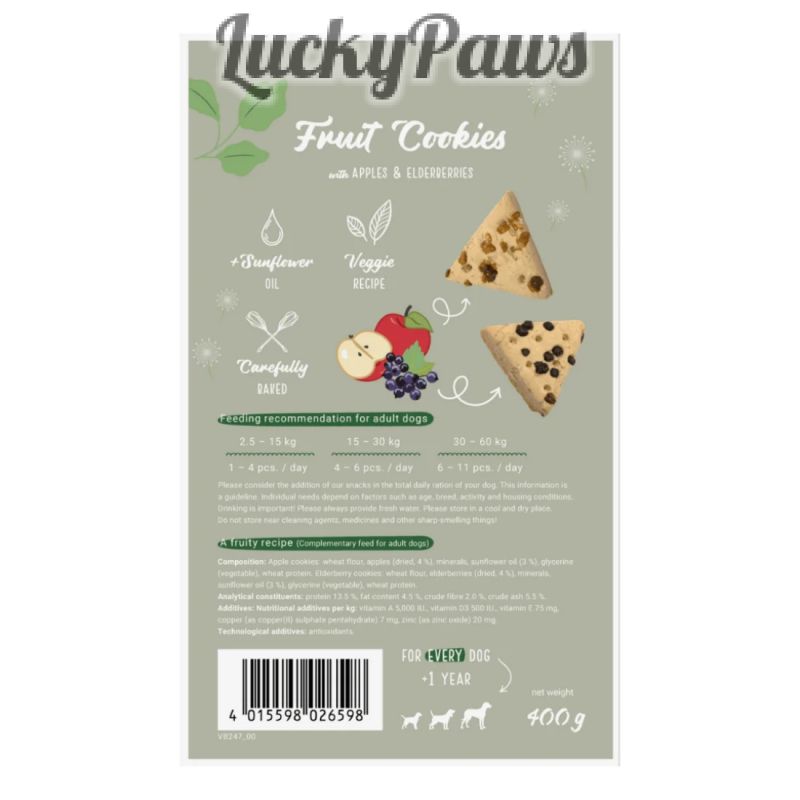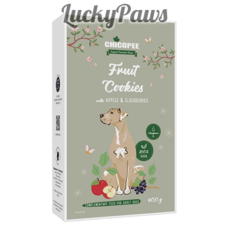 Chicopee Fruit Cookies са висококачествени бисквити за израснали кучета, приготвени по оригинална канадска рецепта. Съчетават в себе си хрупкава текстура, плодови вкусове и внимателно подбрани растителни съставки. Напълно ВЕГАН формула, създадена както за наслада, така и за подпомагане на доброто здраве на вашето куче.