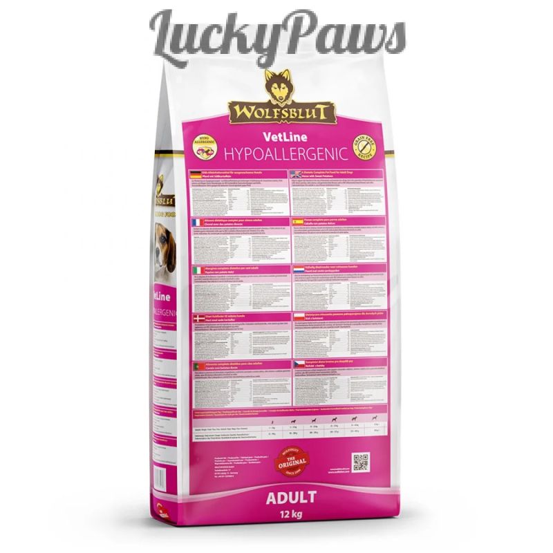 WOLFSBLUT VetLine HYPOALLERGENIC е диетична пълноценна храна за израснали кучета за намаляване на симптомите на непоносимост към съставки и хранителни вещества, свързани с хроничен сърбеж, възпаление на външното ухо (отит), както и стомашно-чревни заболявания като IBD (възпалително заболяване на червата) или колит.