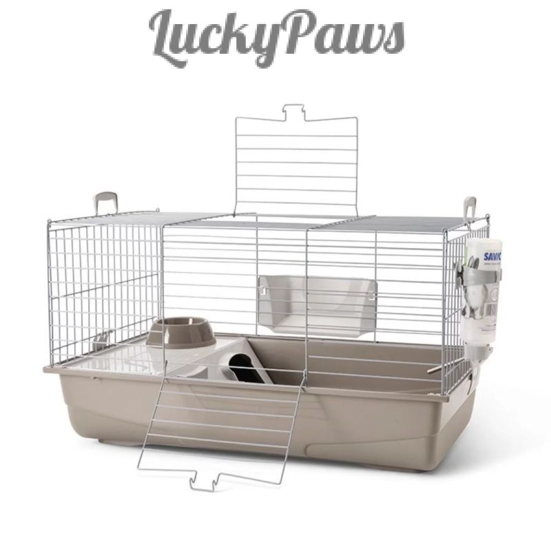 Клетката се предлага с купа за хранене, шише за пиене и стойка за сено, което прави новия дом на малкото животно готов за нанасяне веднага. Вратичките, разположени отпред и отгоре, правят храненето на домашния любимец и ежедневното почистване изключително лесно. Двете дръжки улесняват преместването на клеткта.
