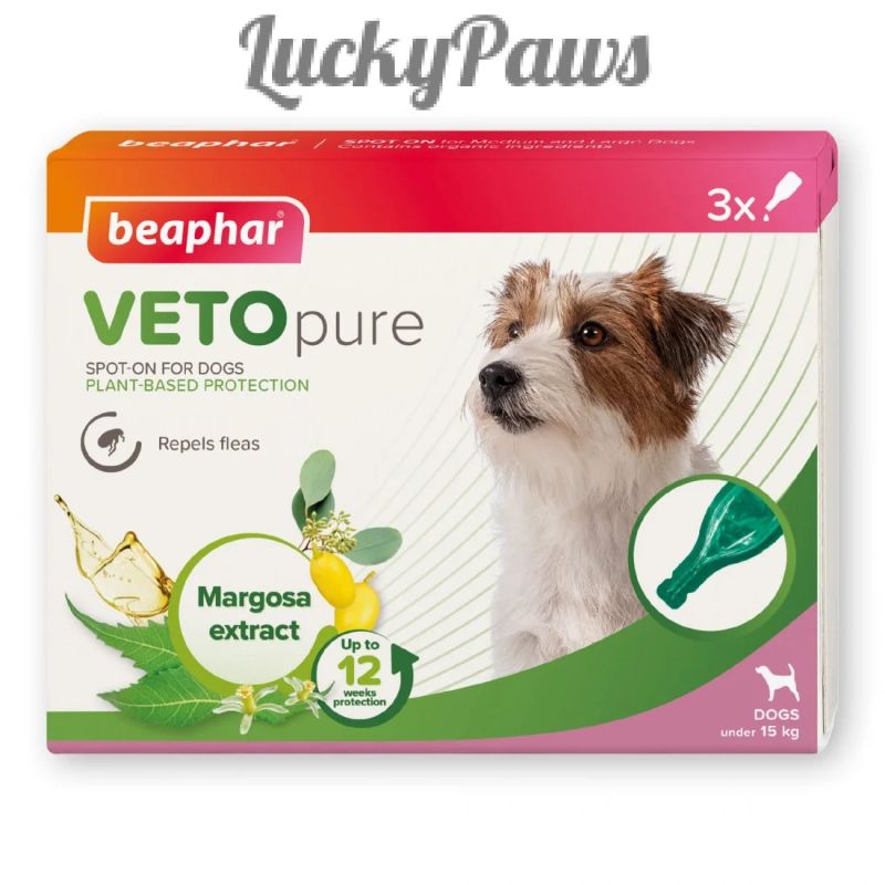Beaphar VETOpure Spot-On за кучета съдържа натурални растителни екстракти, включително масло от маргоза и евкалипт цитриодора за отблъскване на бълхите от кучетате до 4 седмици. Спот-онът трябва да се използва като част от ефективна програма за борба с бълхите. Бълхите често заразяват местообитанието и обичайните зони за почивка на вашия домашен любимец, включително килими и мека мебел. Препоръчително е тези места да се третират с подходящ битов инсектицид и редовно да се почистват с прахосмукачка.