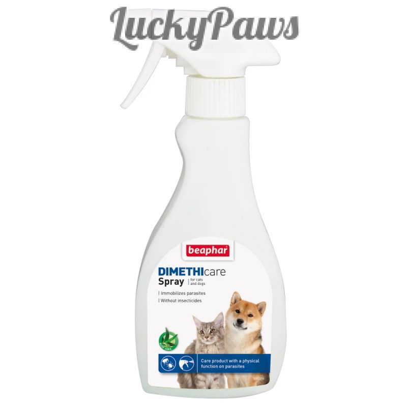 Спрей за котки и кучета Dimethicare Spray е базиран на Диметикон, който парализира бълхи, кърлежи и други насекоми като например комари, въшки, ларви, пясъчни мухи и други по изцяло физичен начин, и Алое Вера, която има благоприятен ефект върху възстановяването на кожата в случай на ухапвания от насекоми и е известна със своята антибактериална фукция.Този продукт не съдържа химически инсектициди. Активната съставка Диметикон образува слой, функциониращ като „лепкав капан“: бълхите, кърлежите и насекомите се парализират поради физическото блокиране на техните стави. Диметикон е ефективен при всички фази на развитие на бълхите.